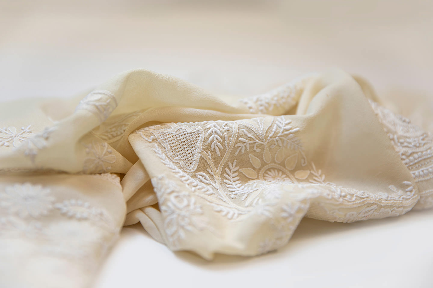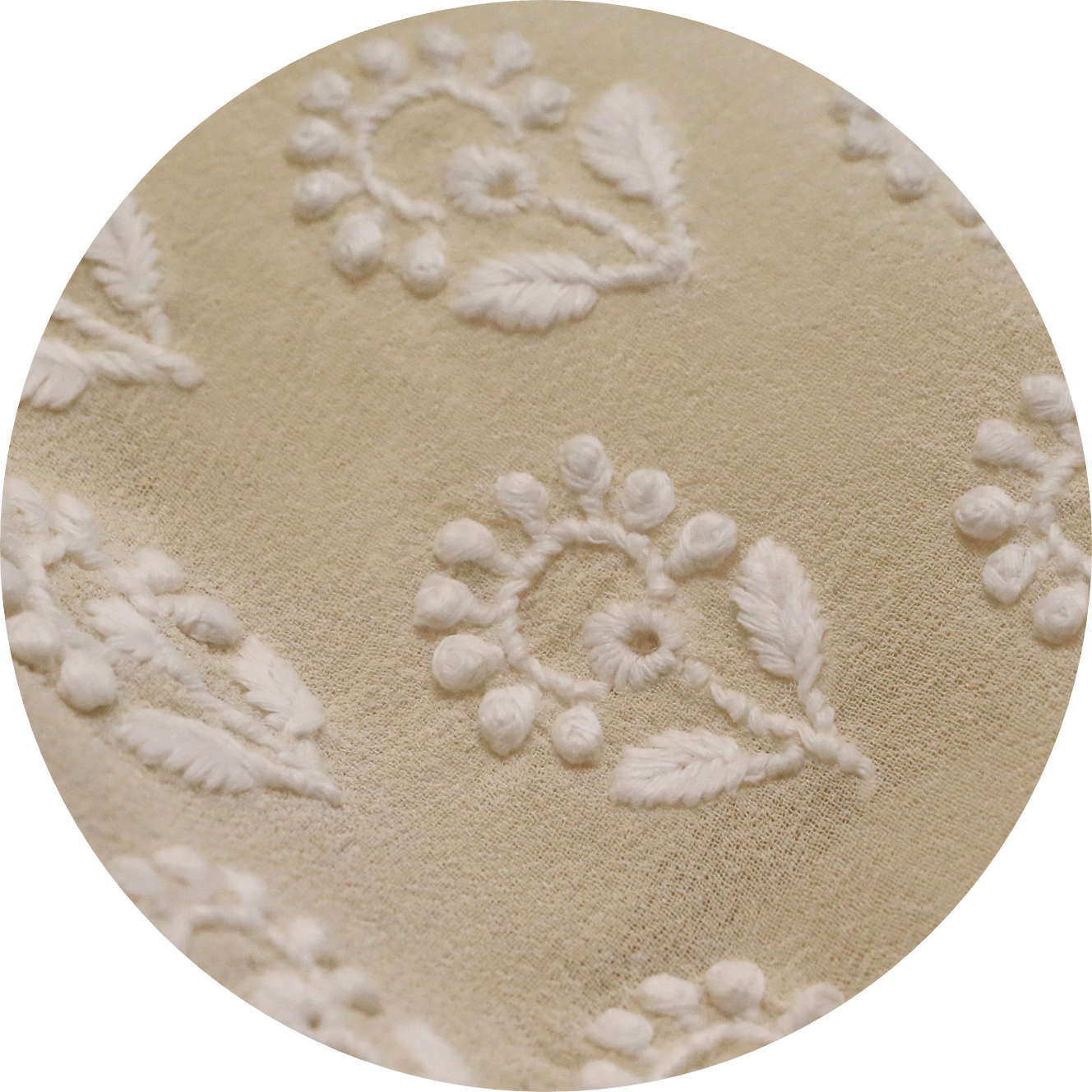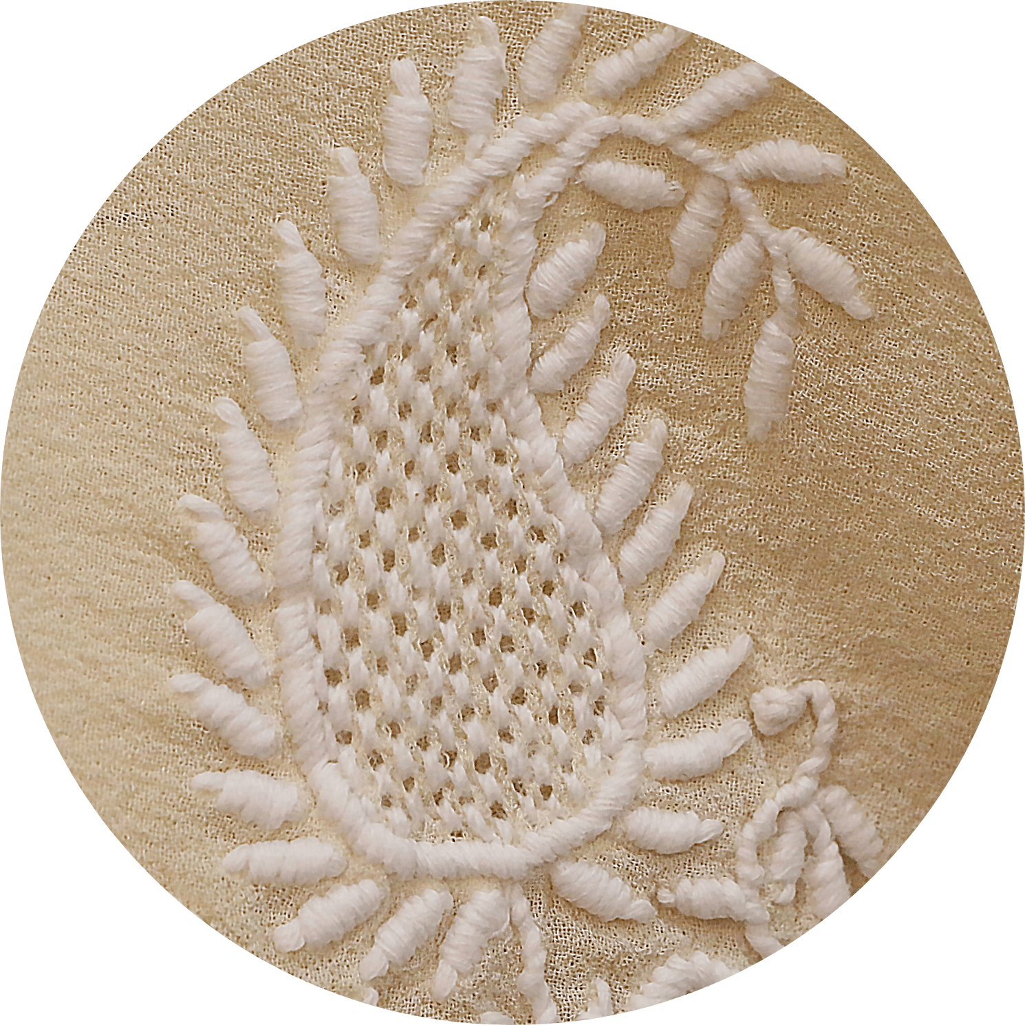 The rarest one. This mesh-like stitch is inspired by royal architecture, and gives Chikankari its signature look. It is created by separating the strands of the warp and weft and tightening it to hold it in position. Now an almost extinct skill, known only to a handful of artisans.